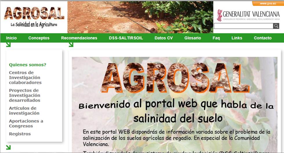 En este portal AGROSAL (www.agrosal.ivia.es), orientado al agricultor y a otros usuarios potenciales, se podrán consultar conceptos sobre la salinidad del suelo, su forma de evaluación, la extensión del problema, recomendaciones genéricas de manejo agrario, acceder a bases de datos de calidad de aguas, de características del suelo (con más de 470 puntos de información, distribuida por toda la Comunidad Valenciana) y cartografía temática de la Comunidad Valenciana. En AGROSAL también podrán utilizar el sistema de recomendación de manejo de riego en condiciones salinas DSS-SALTIRSOIL, con el que se podrá planificar el manejo del riego que minimice el problema de la salinidad del suelo en la Comunidad Valenciana.
