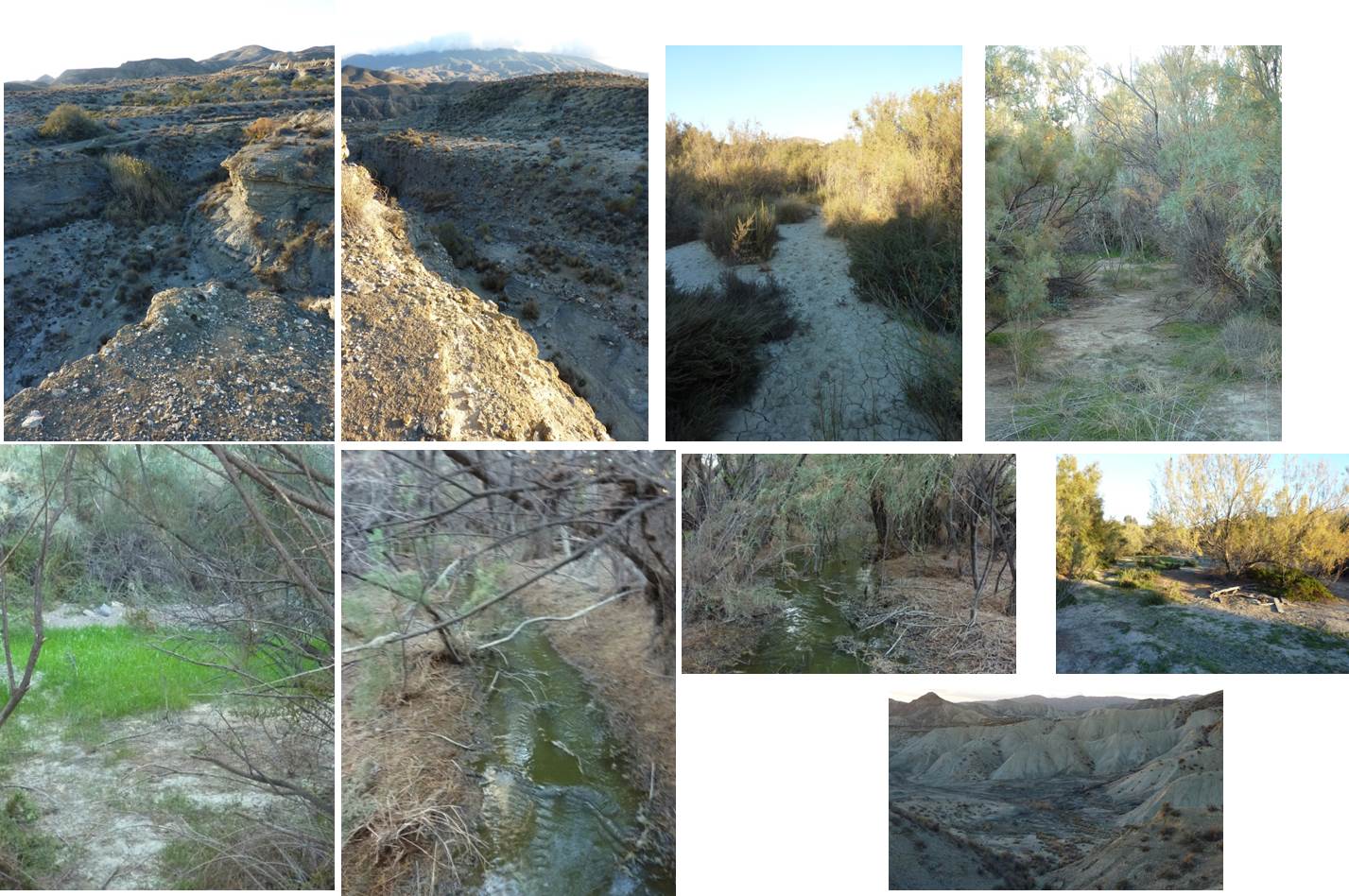 Como podréis observar, la vegetación variaba rápidamente con tramos secos, húmedos, hilillos de agua que desaparecían súbitamente y algunas charcas dispersas. Generalmente estos cauces y sus lechos suelen aparecer “aparentemente secos”. Empero, a menudo, bajo ellos, las capas freáticas suben y bajan a lo largo de varios metros de profundidad, aunque frecuentemente alcancen las raíces de las plantas.