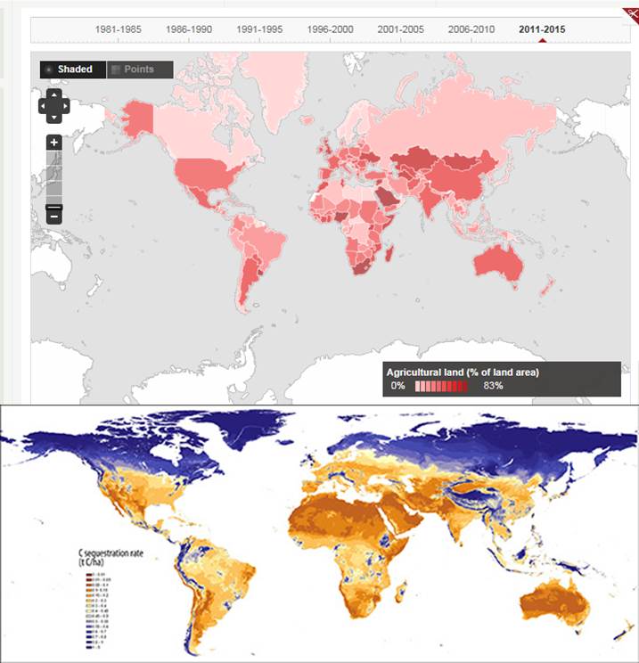 – Si te lees Wikipedia, o esta otra página Web del Banco Mundial, verás que actualmente el 38.0% del total de la superficie terrestre emergida es tierra cultivable (he leído también otras michas cifras, ni tan siquiera sabemos a que atenernos), mientras que la extensión ocupada por suelos fértiles es mucho más exigua, que junto a otros factores dan lugar a que tan solo el 11% puedan regalarnos buenas cosechas. En parte de este pequeño pedazo de edafosfera, un incremento excesivo de sus contenidos de materia orgánica podría incluso dar lugar a un deterioro de su calidad, te lo repito por enésima vez. Tampoco sabemos con exactitud el balance entre secuestro y emisiones de carbono por el suelo, ya que su estimación es mucho más compleja de lo tu inocentemente crees y la enorme cantidad de tipos de suelos demandan analizar tales balances con detalle, ya que sus propiedades varían enormemente. Pero no tenemos tales datos. Alegar que con la iniciativa 4×100 paliamos el problema del calentamiento deviene en una necedad. Ahora bien, “en general” tal incremento sería bueno para mejorar las propiedades del suelo y como corolario dar un pasito para garantizar la soberanía alimentaria. El problema se solucionará cuando emerja una gobernanza mundial que sea capaz de garantizar la mentada soberanía alimentaria, que erradique las desigualdades sociales, encuentre un modelo energético sustentable en base a criterios ecológicos que frenen e incluso reviertan la degradación que sufre nuestro planeta. ¡Vamos una revolución social global!.