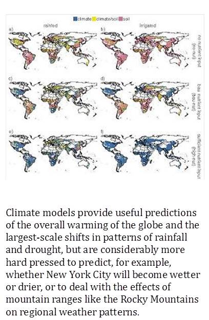 Climate models provide useful predictions of the overall warming of the globe and the largest-scale shifts in patterns of rainfall and drought, but are considerably more hard pressed to predict, for example, whether New York City will become wetter or drier, or to deal with the effects of mountain ranges like the Rocky Mountains on regional weather patterns.