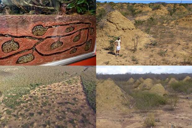 Montículos de termitas que permanecían ocultos bajo la densa vegetación de la caatinga. Los campos que se muestran aquí son visibles porque la tierra fue despejada para el pastoreo. Los científicos han descubierto una inmensa agrupación de montículos creados por termitas al noreste de Brasil. Oculta entre los árboles, la enorme estructura ha tardado 4000 años en ser detectada, aunque ocupe un área similar a Gran Bretaña. Según un artículo publicado hoy en Current Biology, hay más de 200 millones de montículos espaciados regularmente. Miden alrededor de 2,5 metros de alto por 9 de ancho, y cubren un total de 230.000 kilómetros cuadrados de bosque seco en una región relativamente tranquila. Han sido construido a lo largo de miles de años por un número incalculable de termitas que pertenecen a la misma especie, Syntermes dirus.