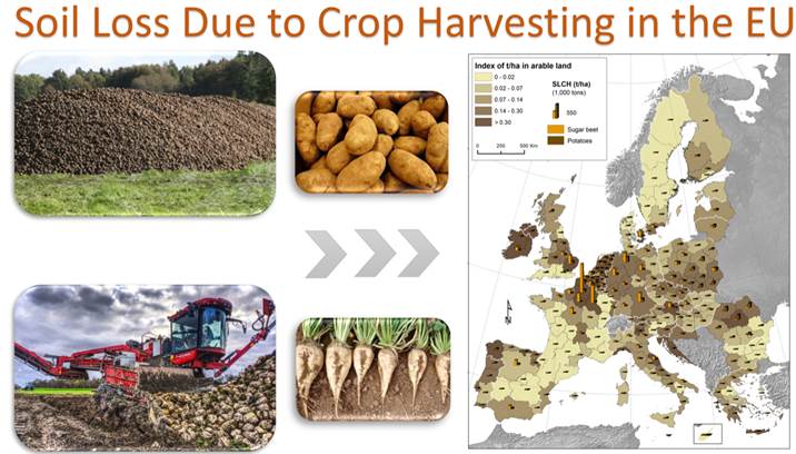 Over the last two decades or so, there has been a lot of research carried out to understand the mechanics and spatial distribution of soil loss by water erosion and to a lesser extent of wind, piping and tillage erosion. The acquired knowledge helped the development of prediction tools useful to support decision-makers in both ex-ante and ex-post policy evaluation. In Europe, recent studies have modelled water, wind and tillage erosion at continental scale and shed new light on their geography. However, to acquire a comprehensive picture of soil erosion threats more processes need to be addressed and made visible to decision-makers. Since 1986, a small number of studies have pointed to an additional significant soil degradation process occurring when harvesting root and tuber crops. Field observations and measurements have shown that considerable amounts of soil can be removed from the field due to soil sticking to the harvested roots and the export of soil clods during the crop harvest. This study aims to scale up the findings of past studies, carried out at plot, regional, and national level, in order to obtain some preliminary insights into the magnitude of soil loss from cropland due to sugar beets and potatoes harvesting in Europe. We address this issue at European Union (EU) scale taking into account long-term (1975–2016) crop statistics of sugar beet and potato aggregated at regional and country levels.