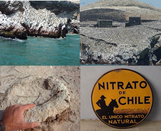 No puedo evitar avocar mis viajes infantiles de Madrid al pueblo de mi Madre en Alicante. Las estrechas y maltrechas carreteras de hace cincuenta años se encontraban jalonadas de carteles entre los cuales, como en el mosaico que os expongo al comienzo de la entradilla, aparece una que se repetía sin parar en el curso de aquellos tortuosos e interminables viajes, en coches sin refrigeración que apenas superaban los 60 Km/hora. Nos referimos al márquetin utilizado para comercializar en España el guano, conocido también por nitrato de Chile (y al parecer, del mismo modo por Nitro del Perú). Las dos fotos superiores son de mi propia cosecha, justamente tomadas en las Islas Ballesta de las tórridas tierras de Paracas en Perú.