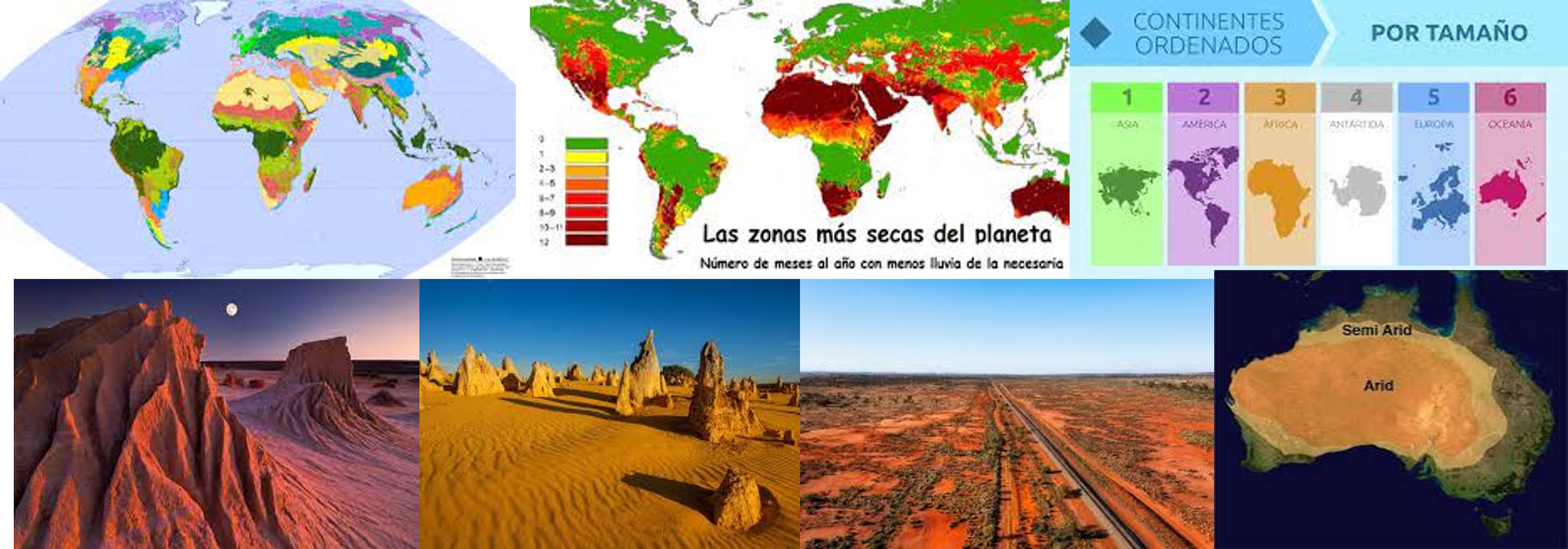 Australia, junto con la Antártida, son dos de los continentes más pequeños del mundo. La cuestión es que la Antártida se encuentra mayoritariamente cubierta de hielo, por lo que atesora “otro tipo de aridez”. Del mismo modo el continente australiano sí es el más árido del planeta, como se atestigua en el mosaico de fotos que encabezan este entradilla. De hecho, la inmensa mayoría de Australia se encuentre en los dominios climáticos, desérticos, áridos y semiáridos. Resumiendo un continente muy especial debido a su pequeño tamaño relativo, ambientes extremos y prolongados déficits hídricos.