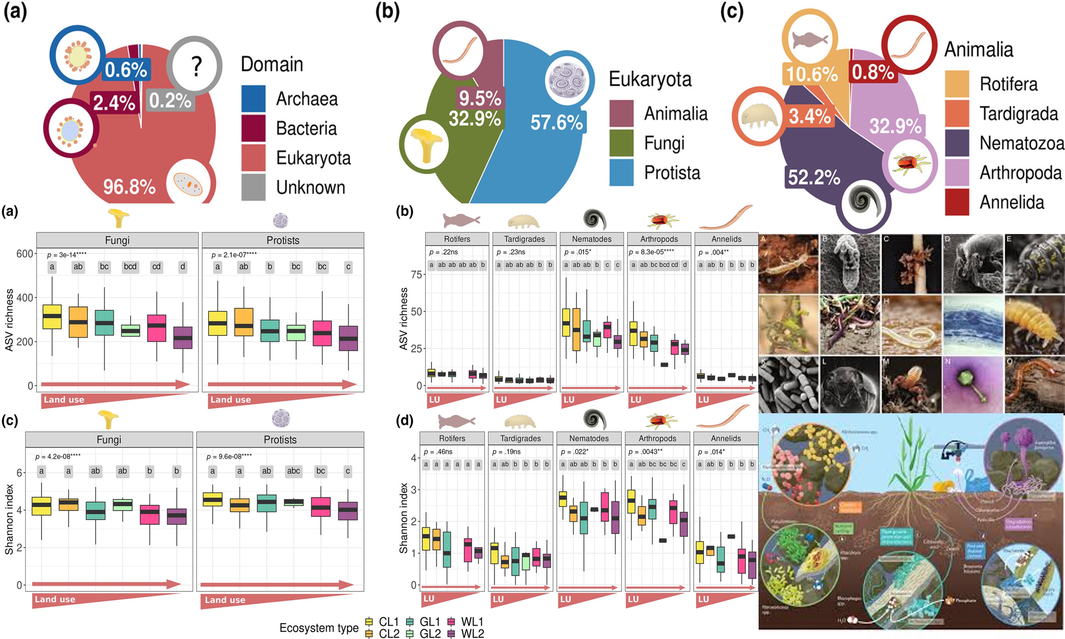 Encontramos que la diversidad de hongos, protistas, rotíferos, tardígrados, nematodos, artrópodos y anélidos estaba predominantemente determinada por el tipo de ecosistema (tierras de cultivo anuales y permanentes, pastizales manejados y no manejados, bosques de coníferas y frondosas), y se observó una mayor diversidad de hongos, protistas, nematodos, artrópodos y anélidos en tierras de cultivo que en sistemas menos manejados intensivamente, como los bosques de coníferas y frondosas. También en las tierras de cultivo, encontramos eucariotas más especializados, mientras que la composición entre tierras de cultivo fue más homogénea en comparación con la composición de otros ecosistemas.
