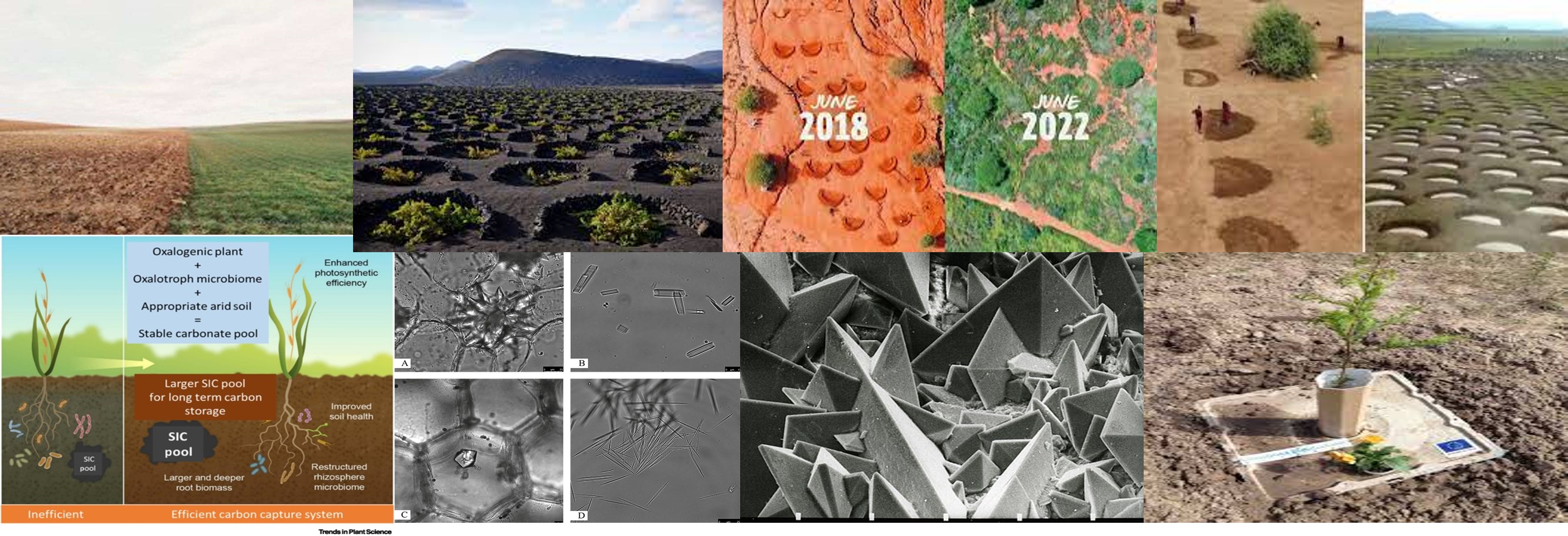 (…) Proponemos que la ingeniería suelo-planta-microbioma con plantas oxalogénicas y microbios oxalotróficos podría facilitar el secuestro de C a escala global (….) la reforestación generalmente se dirige a tierras que compiten directamente con la producción de alimentos y muchos bosques naturales se perdieron en los últimos años debido a la conversión de bosques en tierras agrícolas. Por el contrario, un tercio de la superficie terrestre de nuestro planeta es tierra árida que no se utiliza para la agricultura y está sujeta a una degradación significativa. En los últimos años se han puesto en marcha varios grandes proyectos de reforestación para recuperar regiones áridas. Hasta ahora, se ha pasado por alto el potencial de replantar tierras áridas para la captura de C. Proponemos aquí que la reforestación de tierras áridas mediante ingeniería ecosistémica apropiada no solo devolvería tierras apenas cubiertas a la vegetación, sino que también podría proporcionar sitios ideales para el secuestro de C. La ventaja de recuperar las regiones áridas para el reverdecimiento y el secuestro de C es que no compiten con las tierras utilizadas en la agricultura y la producción de alimentos (…) El suelo C (3100 Gt C) comprende carbono orgánico del suelo (SOC) como 1500-1600 Gt C y carbono inorgánico del suelo (SIC) como 700-1700 Gt C y contribuye en gran medida a las reservas totales de C terrestre (…)