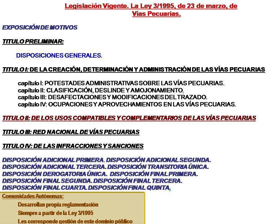 El Texto Legal actual Ley 3/1995 de 23 de marzo declara de manera contundente la demanialidad de las vías pecuarias al considerarlas como “bienes de dominio público de las Comunidades Autónomas y, en consecuencia, inalienables, imprescriptibles, e inembargables”; declaración acorde al art. 132 de