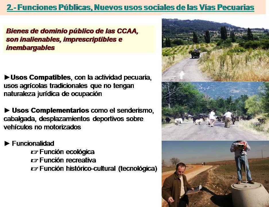 Lo novedoso de esta ley, es la ampliación de los fines de estas infraestructuras lineales: la ley define a las Vías Pecuarias como “rutas o itinerarios donde discurre o ha venido discurriendo tradicionalmente el ganado”, señalándose a continuación que “Asimismo, las Vías Pecuarias podrán ser destinadas a otros usos compatibles y complementarios en términos acordes con su naturaleza y sus fines, dando prioridad al tránsito ganadero y otros usos rurales e inspirándose en el desarrollo sostenible y el respeto al medio natural, al propio paisaje y al patrimonio natural y cultural”.