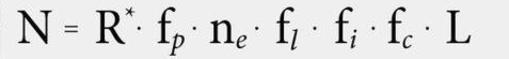 En la que N es el número de civilizaciones tecnológicamente avanzadas; R, el número total de estrellas en la vía láctea; fp, la fracción de esas estrellas que tienen sistemas planetarios; ne, el número de planetas apropiados para la vida por cada sistema planetario; fl, la fracción de esos planetas donde se desarrolla vida; fi, la fracción de esos planetas donde se desarrolla la inteligencia; fc, la fracción de esos planetas capaces de comunicarse mediante señales de radio y L, la fracción de tiempo de vida del planeta durante la cual vive la civilización.