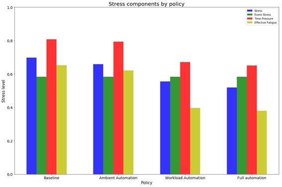 Para saber qué políticas resultarían más adecuadas para reducir los niveles de estrés de los trabajadores hasta valores adecuados, los investigadores testaron cuatro tipos de políticas de actuación: Sin automatización (no existe un sistema de adaptación ni de registro para detectar el estado de los trabajadores o los parámetros ambientales); adaptación del entorno (automatización del control de las condiciones ambientales - temperatura, humedad o ruido- garantizando que estén cerca de los valores óptimos; adaptación de la carga de trabajo (automatización de las tareas relacionadas con la carga de trabajo); y adaptación total (adaptación tanto de las condiciones ambientales como de la carga de trabajo).