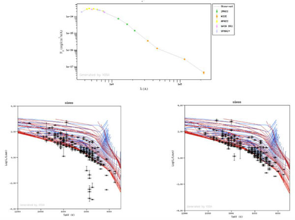 El Instituto Nacional de Técnica Aeroespacial (INTA), a través del Centro de Astrobiología (CAB, CSIC-INTA), lidera y coordina, desde 2004, las actividades de Observatorio Virtual en España. En el marco del proyecto Gaia, el grupo de VO se ha centrado en el desarrollo de dos herramientas de análisis que permitan a los astrónomos trabajar de manera rápida y precisa con toda la información que, sobre los objetos Gaia, existe en el universo del Observatorio Virtual: VOSA y Clusterix. El catálogo Gaia proporciona información del brillo de las estrellas solamente en tres longitudes de onda. Para poder conocer parámetros físicos fundamentales de las mismas, es necesario complementar la información de Gaia con medidas de brillo a otras longitudes de onda, desde el rango ultravioleta hasta el infrarrojo y analizar estos datos comparándolos con modelos teóricos. VOSA, desarrollada en el CAB en colaboración con científicos de la Universidad de Valparaíso (Chile), realiza todo este proceso de manera automática para miles de objetos a la vez (figura 1).