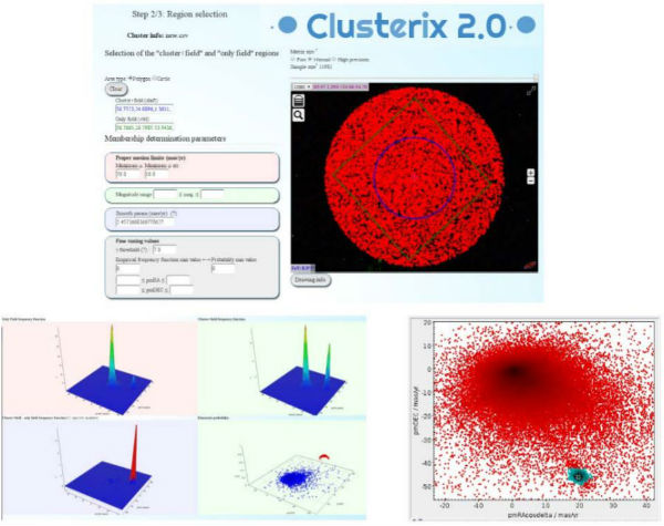 Los cúmulos estelares son estructuras básicas para entender el nacimiento y evolución de las estrellas. Las estrellas de un cúmulo son parte de una misma "familia" y, como tales, comparten rasgos de identidad propios –todas tienen la misma edad, se mueven en la misma dirección, se encuentran a la misma distancia y su composición química es muy similar–. Se espera que Gaia incremente de manera significativa el número de cúmulos conocidos, pero para ello es necesario determinar los parámetros físicos de sus miembros, comprobando que poseen un patrón común y distinto al de las estrellas de su vecindad. Para facilitar esta ingente tarea, el grupo de VO, en colaboración con científicos de la Universidad de Barcelona (ICCUB-IEEC), ha desarrollado Clusterix, una herramienta que permite, de manera fácil y eficiente para el astrónomo, recopilar toda la información existente sobre movimientos y distancias, visualizarla y asignar la probabilidad de pertenencia de un determinado objeto a un cúmulo (figura 2).
