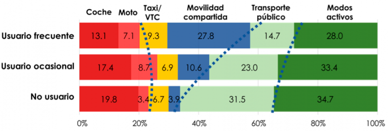 Reparto modal según el tipo de usuario de motosharing (usuario frecuente, usuario ocasional y no usuario). Autor: Aguilera-García et al. (2021).