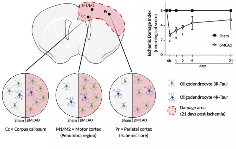 La figura ilustra cómo tras una isquemia cerebral incrementa el número de oligodendrocitos Tau-3R+ en el área de daño, de forma paralela a la mejora neurológica en los animales con la isquemia /UAM