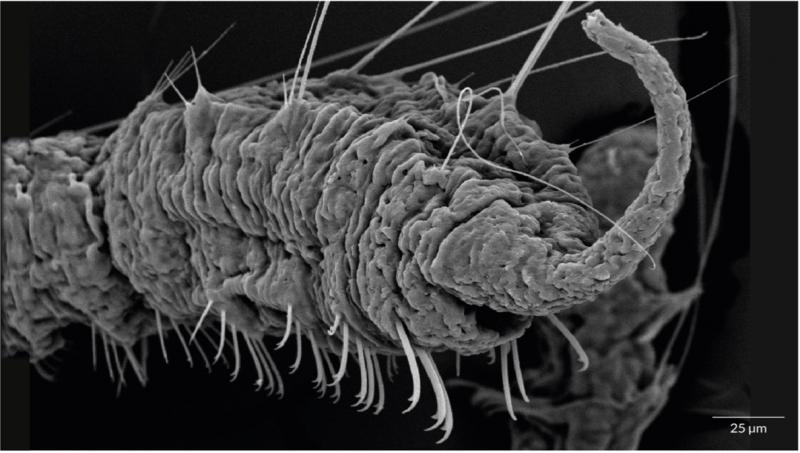 Cabeza del gusano segmentado de agua dulce Pristina leidyi. Se puede ver el gusano con la boca abierta justo por debajo de una prolongación en forma de trompa que funciona como aparato sensorial. También se pueden apreciar las “patas” o sedas arriba y abajo del cuerpo, que ayudan en el desplazamiento. Imagen tomada mediante microscopía electrónica de barrido. / Irene del Olmo et al.