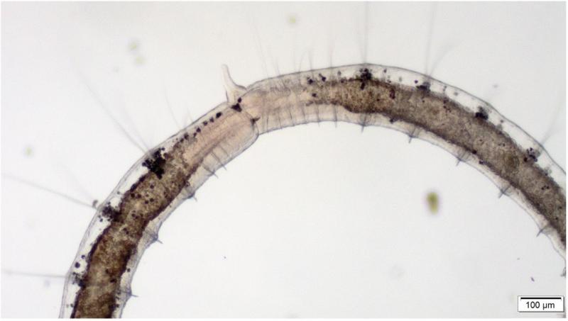 Fotografía: Reproducción asexual en el gusano de agua dulce Pristina leidyi. En este tipo de reproducción, un nuevo individuo comienza a desarrollarse en el medio del cuerpo del animal original, y una vez que está completamente formado las dos partes se separan dando lugar a dos nuevos gusanos. / Irene del Olmo et al.