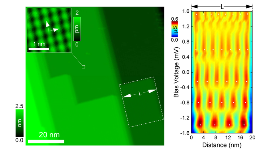 A la izquierda, escalones de tamaño atómico en una superficie. Imagen tomada a tan solo 0.1 grados por encima del cero absoluto con un microscopio construido íntegramente en la UAM. El color indica la altura. La diferencia de altura entre dos escalones es de tan solo unos pocos átomos. En la parte de arriba a la izquierda se observa la red atómica. Las flechas indican las direcciones cristalográficas. A la derecha, dependencia de la conductancia en función de la energía (eje y) y de la posición (eje x). La conductancia es proporcional a la función de onda cuántica. Se observan máximos de la función de onda en las posiciones marcadas por puntos blancos. Resultados obtenidos en el Laboratorio de bajas Temperaturas y Altos Campos Magnéticos del Departamento de Física de la Materia Condensada de la Facultad de Ciencias / Edwin Herrera.
