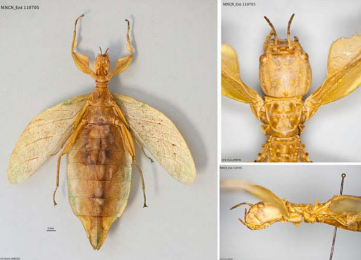 Cuando Phyllium regina llegó hace más de un siglo a la colección del Museo Nacional de Ciencias Naturales (MNCN-CSIC) nadie supo asignarla a una especie concreta. Probablemente fue Ignacio Bolívar, especialista en ortópteros (saltamontes, grillos, langostas, etc) y luego director de la institución quien lo guardó celosamente en la Colección de Entomología. Han tenido que pasar más de cien años para que esta especie de gran tamaño haya sido descrita y lo ha hecho un equipo de investigadores liderados por el experto en el género R.T. Cumming gracias al ejemplar que se conserva en el MNCN y que es ahora el holotipo de la especie.