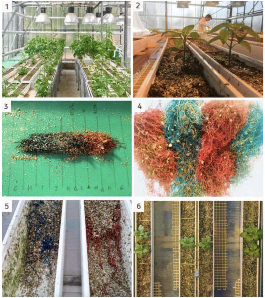 1 y 2) invernadero de experimentación. 3 y 4) Raíces obtenidas en los diferentes experimentos. Las raíces de las plantas se tiñeron para facilitar su análisis. 5 y 6) Maceteros y diferentes separaciones entre plantas. // Ciro Cabal.