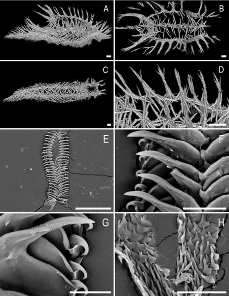 A-D. Imágenes de microtomografía computarizada de la “armadura” calcárea de Lophodoris danielsseni. A, vista lateral; B, vita dorsal; C, vista ventral; D, detalle de la “cresta” dorsal. E-H. Imágenes de microscopio electrónico de barrido. E, rádula completa;  F, detalle de los dientes internos de la rádula; G, detalle de los dientes externos de la rádula; H, espinas peniales. Escala gráfica: A-D, 250 μm; E, 300 μm; F, 50 μm; G, 30 μm; H, 50 μm. | a, b, d, e. Imágenes de micro-CT de la reconstrucción las estructuras internas de Lophodoris danielsseni usando el software Amira. C. Dibujo del Sistema reproductor mediante disección al microscopio óptico. Escala gráfica 1 mm.
