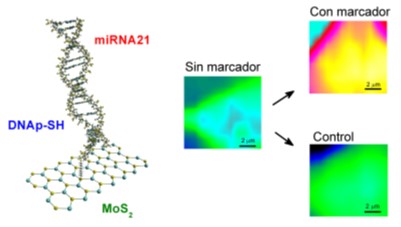 Ahora, investigadores de los grupos de Electrónica y Semiconductores y de Química Analítica de la Universidad Autónoma de Madrid (UAM), en colaboración con la Universidad de Alabama y el Instituto de Ciencia de Materiales de Madrid (CSIC), han desarrollado un método que permite detectar un biomarcador específico del cáncer de mama (el micro-ARN21) mediante la luminiscencia de capas monoatómicas de disulfuro de molibdeno (MoS2).