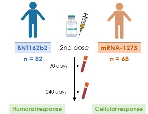 La vacunación contra el SARS-CoV-2 se ha convertido en el principal método para reducir la mortalidad y la gravedad de la COVID-19. Una gran parte de la población fue vacunada con las nuevas vacunas basadas en el mARN, que ha revolucionado la manera de generar vacuna en un tiempo récord durante esta pandemia. Un grupo de investigadores de centros de investigación españoles, liderado por la Dra. Marjorie Pion (Laboratorio de Inmuno-Regulación del Hospital General Universitario Gregorio Marañón), ha estudiado la evolución de las respuestas celulares y humorales conferidas por dos vacunas de ARNm tras dos dosis frente al SARS-CoV-2. La respuesta humoral está basada en los anticuerpos, que son como las balas del sistema inmune. La respuesta celular, como su nombre le indica, se basa en la capacitad de las células específicas del virus de reconocerle y de activar diferentes mecanismos para combatir la infección. El conjunto de estas células es considerado como el ejército de soldados que defiende el cuerpo, organiza la defensa y permite que se disparasen las balas. Se conoce que los anticuerpos disminuyen con el tiempo y en poco menos de un año tras la vacunación, aunque se pueden todavía detectar anticuerpos en la sangre, los niveles son extremadamente bajo. Por otro lado, se desconoce con exactitud cuál es el tiempo de protección de la respuesta celular, que es central en la protección frente a nueva infección. Por ello, en los días 30 y 240 después de la segunda dosis de ambas vacunas (aproximadamente 1 y 8 meses), se evaluaron los anticuerpos frente a la proteína S (Spike) viral en plasma de 82 voluntarios vacunados con BNT162b2 (comúnmente llamado la vacuna de Pfizer) y 68 vacunados con mRNA-1273 (Moderna). La sangre periférica se estimuló con péptidos que abarcaban toda la secuencia de SARS-CoV-2 Spike, para cuantificar la respuesta celular, observándose una mayor respuesta (tanto humoral como celular) con la vacuna mRNA-1273. A los 8 meses tras la vacuna se determinó que alrededor de 12% de los vacunados con la vacuna mRNA-1273 habría perdido su protección, contra 45% de los vacunado con BNT162b2. En conclusión, encontramos que la vacuna mRNA-1273 confiere mejores respuestas humorales y celulares que BNT162b2, tanto a los 30 como a los 240 días post-vacunación. Esto podría indicar que la vacuna mRNA-1273 protege más contra la infección por SARS-CoV-2 que la vacuna BNT162b2. Por lo tanto, este trabajo podría ayudar a establecer una estrategia de vacunación que podría aplicarse para conferir la máxima inmunidad a los individuos de riesgos