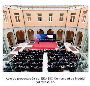 ¿Por qué en Madrid? Porque la Comunidad de Madrid representa el 95% del sector espacial español, siendo una de las regiones que más empleo genera en esta área en Europa. Porque este sector supone un volumen de actividad de 750M€ en España y es altamente innovador (12% reinvertido en I+D+i), productivo (3 veces más que la media en España), exportador (80% de las ventas totales se exportan) y generador un empleo de alta cualificación (Fuente: Madrid Aerospace Cluster y TEDA E). Porque hay un compromiso en la región por el emprendimiento, por el sector y por el trabajo cualificado. Por todo ello, siguiendo los pasos de Barcelona, la Comunidad de Madrid solicitó a la ESA el contar con un ESA BIC en la región, el ESA BIC Comunidad de Madrid, el cual inauguró el pasado mes de junio de 2015 y, realizó su presentación oficial en febrero de 2017. Este acto fue presidido por el Director General de la ESA y por la Presidenta de la Comunidad de Madrid, contando con el apoyo del Colegio Oficial de Ingenieros de Telecomunicación (COIT). Madrid optó para su ESA BIC por un modelo basado en las sinergias entre diferentes socios.