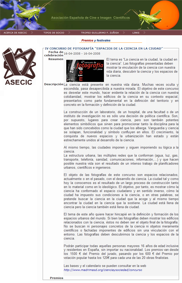 El tema es La ciencia en la ciudad, la ciudad en la ciencia. Las fotografías presentadas deben mostrar la vinculación de la ciencia con nuestra vida diaria, descubrir la ciencia y los espacios de la ciencia.