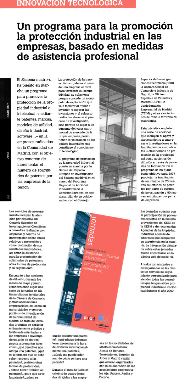 El Sistema madri+d ha puesto en marcha un programa para promover la protección de la propiedad industrial e intelectual mediante patentes, marcas, modelos de utilidad, diseño industrial, software... en las empresas radicadas en la Comunidad de Madrid, con el objetivo concreto de incrementar el número de solicitudes de patentes por las empresas de la región.