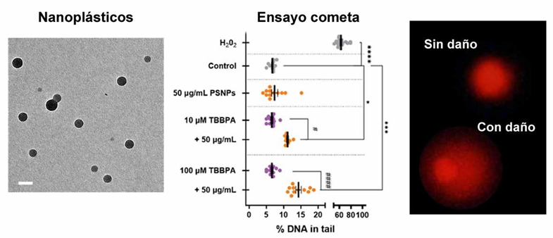 Izquierda: aspecto de los nanoplásticos observados mediante microscopía electrónica de transmisión, la escala son 100 nm. Centro: resultados cuantitativos del ensayo cometa para evaluar genotoxicidad en las distintas condiciones experimentales. Derecha: fotos representativas del aspecto de dos núcleos tras el ensayo cometa, uno de células no tratadas, sin daño, y otro de células tratadas, con daño.