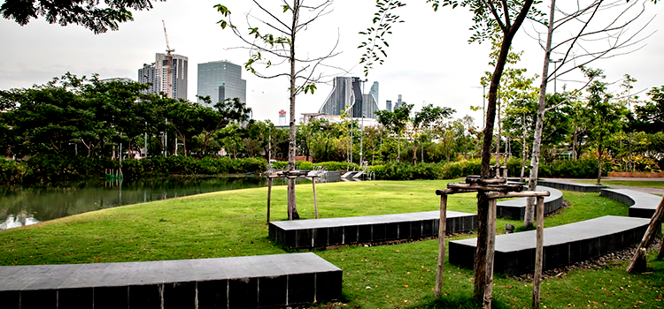 En Bangkok, el parque Chulalongkorn University Centenary fue diseñado para funcionar como un esponja urbana, absorbiendo grandes cantidades de agua durante la temporada de lluvias. Está constituido con pavimentos permeables y estanques de retención de agua, hechos de materiales reciclables y con una capacidad para retener hasta un millón de litros de agua, que luego se utilizan para riego o se filtran gradualmente hacia el subsuelo.