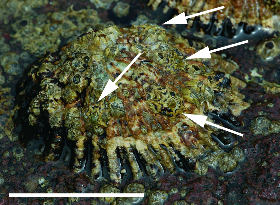 Cuatro reclutas de Patella ferrugínea (flechas) sobre la concha de un adulto. Escala gráfica: 50 mm / Guallart et al. (2022)