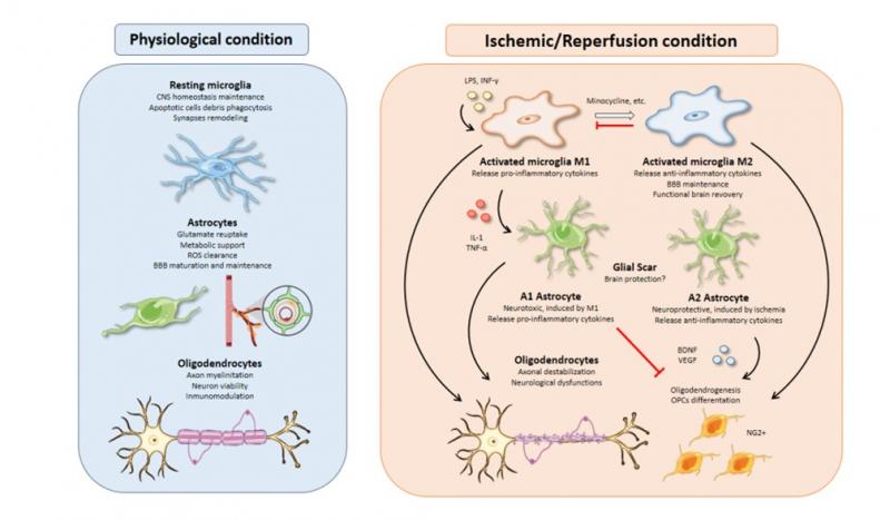 Tras la isquemia, la activación tanto de la microglía como de los astrocitos, presenta una dualidad funcional. Por una parte, pueden adquirir una función neurotóxica e inflamatoria (fenotipo M1/A1), y por otra pueden presentar una función neuroprotectora y anti-inflamatoria (fenotipo M2/A2).