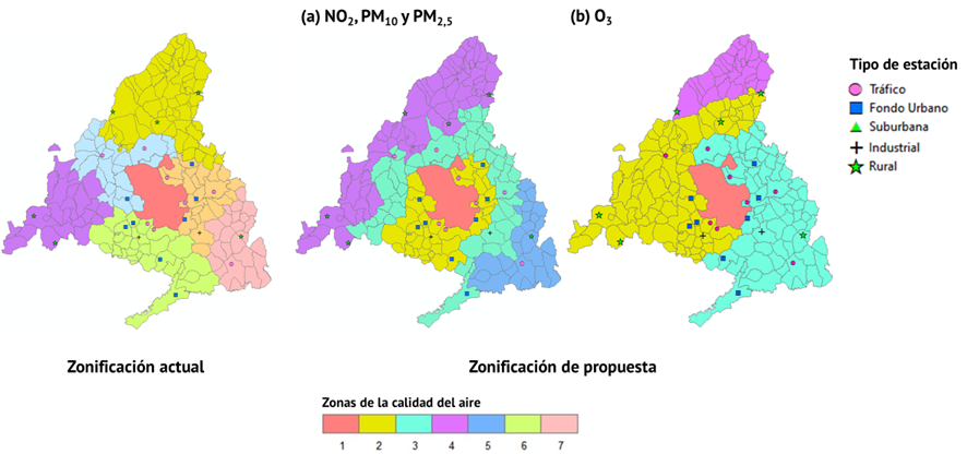 Con el objeto de evaluar la calidad del aire ambiente y facilitar su gestión, todas las comunidades autónomas tienen que establecer las zonas o aglomeraciones siguiendo las determinaciones de la Directiva 2008/50/EC (desarrollada por el Real Decreto 102/2011). Se busca que dentro de una zona determinada la calidad del aire y el nivel de exposición de la población a la contaminación atmosférica sean homogéneos, lo que facilite su adecuada monitorización y el desarrollo de planes y medidas de mejora. Una vez se establece la zonificación de una región, se requiere revisarla cada cinco años. Puesto que la zonificación actual de la Comunidad de Madrid (CM) data de 2014, es preciso proceder a su revisión y actualización. Actualmente, consta de siete zonas que consideran factores meteorológicos, fuentes de las emisiones, geografía, población, etc. Sin embargo, no hay una metodología estandarizada que permita definir zonas homogéneas desde el punto de vista de la calidad del aire de forma más objetiva y cuantitativa.