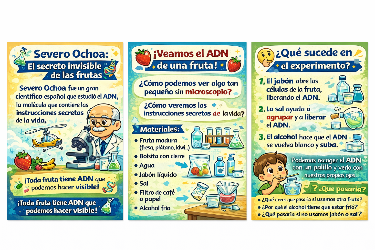 Que todas las frutas (y todos los seres vivos) tienen ADN y que podemos hacerlo visible sin microscopio, usando materiales muy sencillos. Este experimento nos ayuda a entender cómo se guarda la información de la vida, algo que Severo Ochoa estudió durante toda su carrera científica.