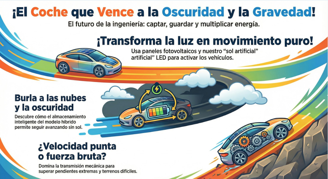 Aquí, el clima y la física están en tus manos. Podrás comprobar cómo la energía solar directa es vulnerable al detenerse ante una simple nube, mientras que nuestro modelo híbrido burla la oscuridad gracias a su almacenamiento inteligente. Pero el reto no acaba ahí: enfrentamos a nuestros vehículos a diferentes terrenos y pendientes extremas. ¿Velocidad punta o fuerza bruta? Entenderás que el futuro de la ingeniería no solo trata de captar energía, sino de saber gestionarla, guardarla y multiplicarla.