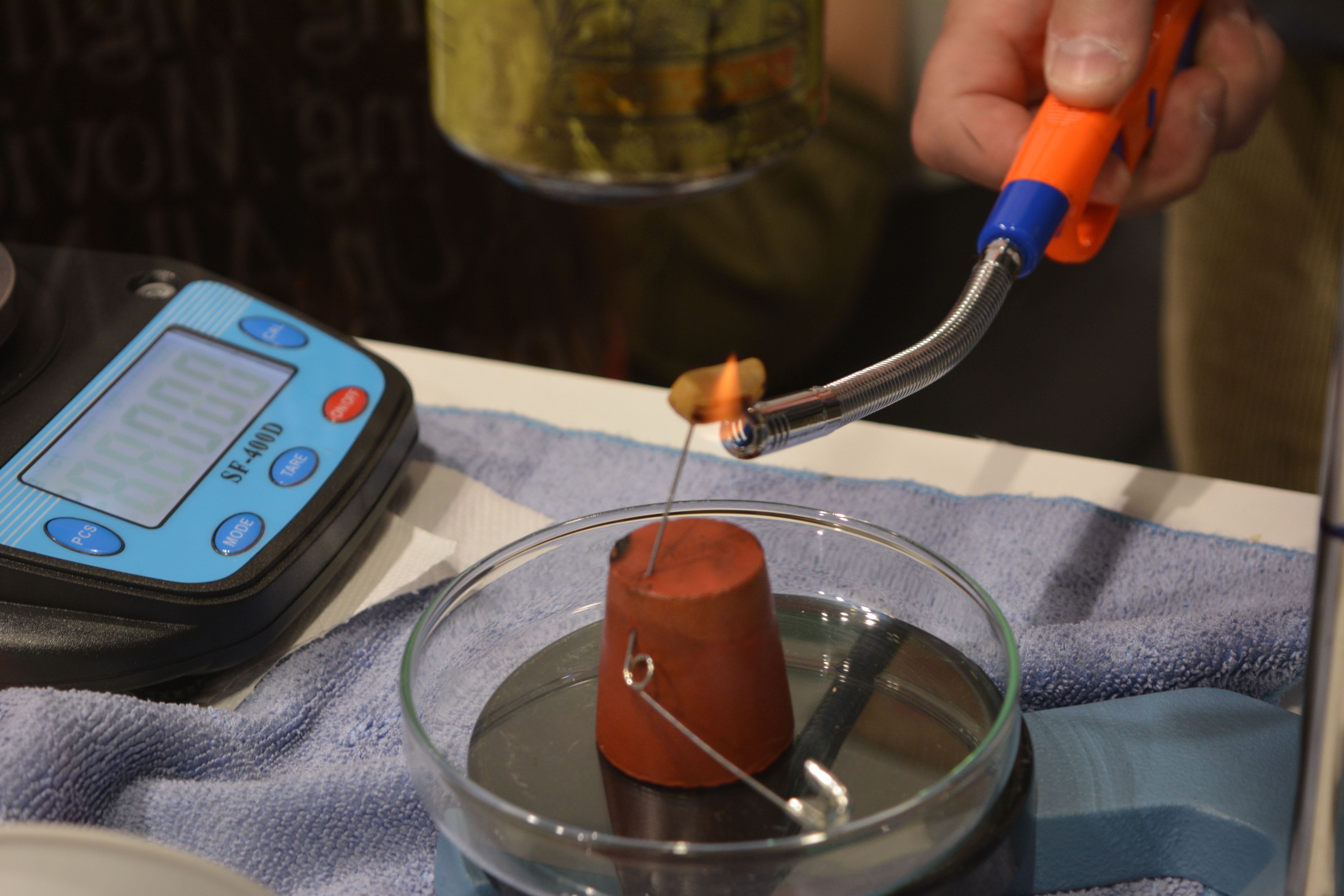 6-encendemos la comida, nuestro fruto seco, con el encendedor manteniéndolo siempre en el mismo punto por no más de 10 segundos: algunos tipos de frutos secos se queman con más facilidad que otros;