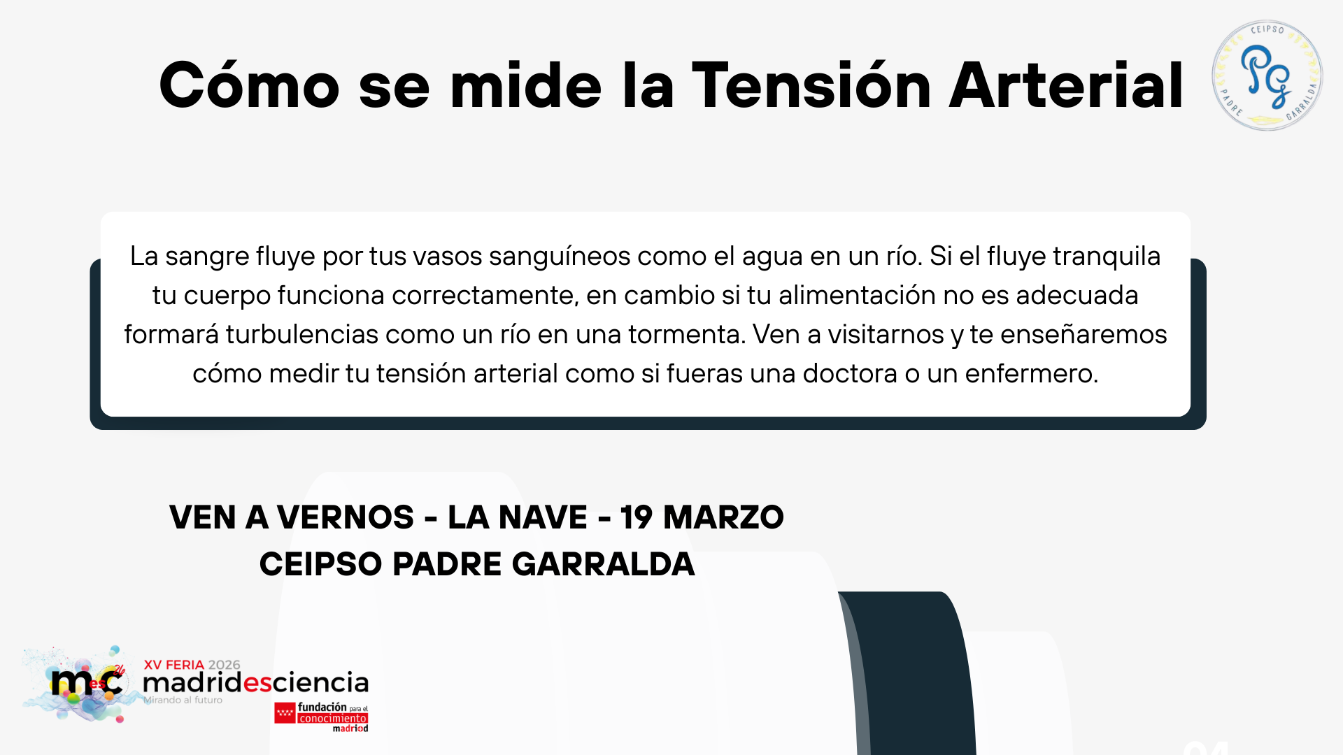 La sangre fluye por tus vasos sanguíneos como el agua en un río. Si el fluye tranquila tu cuerpo funciona correctamente, en cambio si tu alimentación no es adecuada formará turbulencias como un río en una tormenta. Ven a visitarnos y te enseñaremos cómo medir tu tensión arterial como si fueras una doctora o un enfermero.