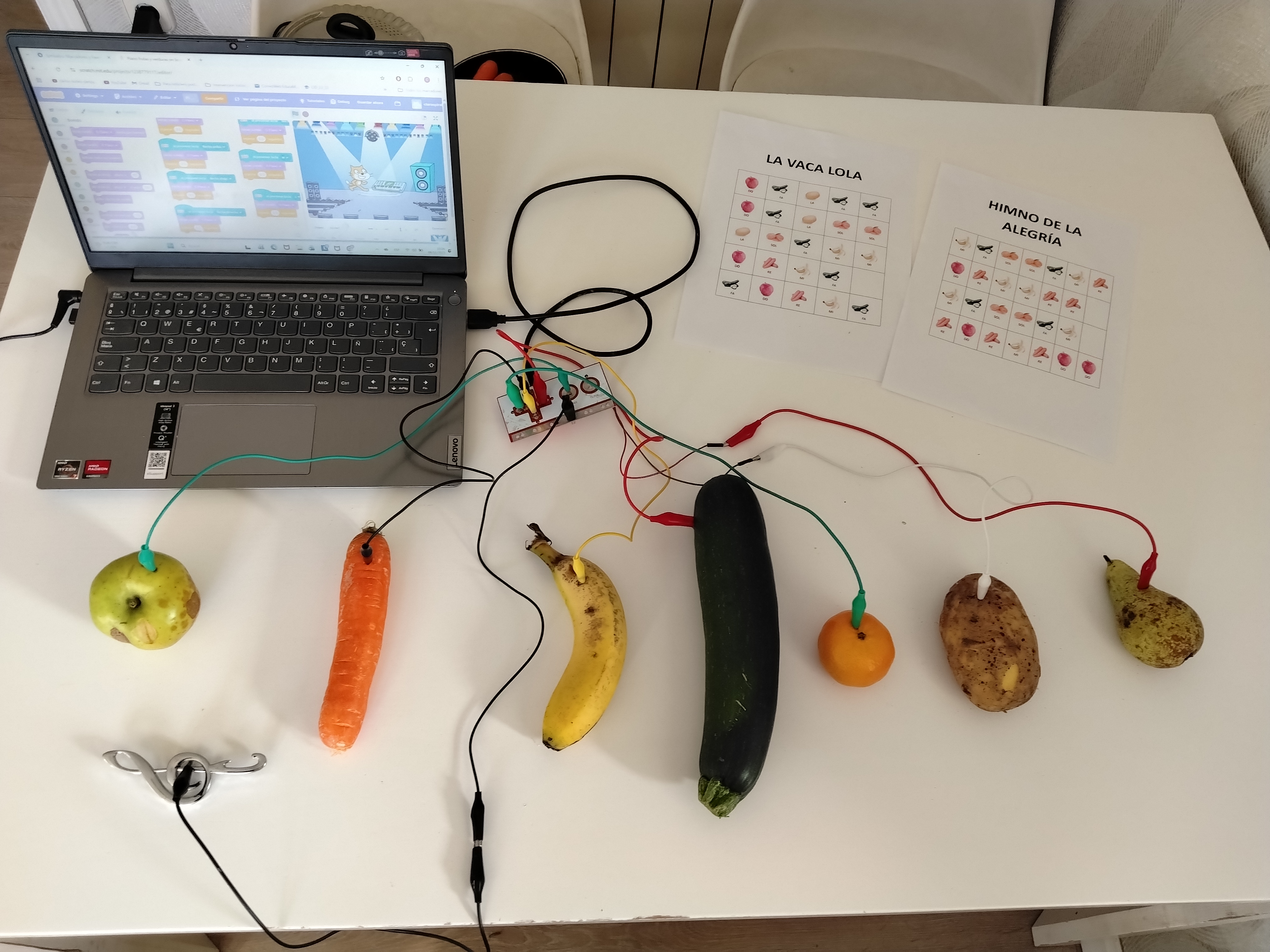 Hemos programado las distintas teclas para que al tocar las frutas y verduras suene una nota musical distinta, ya que al cerrar el circuito eléctrico el programa Scratch se pone en funcionamiento. Esto ocurre porque, como hemos dicho antes, las frutas y verduras transmiten la electricidad.