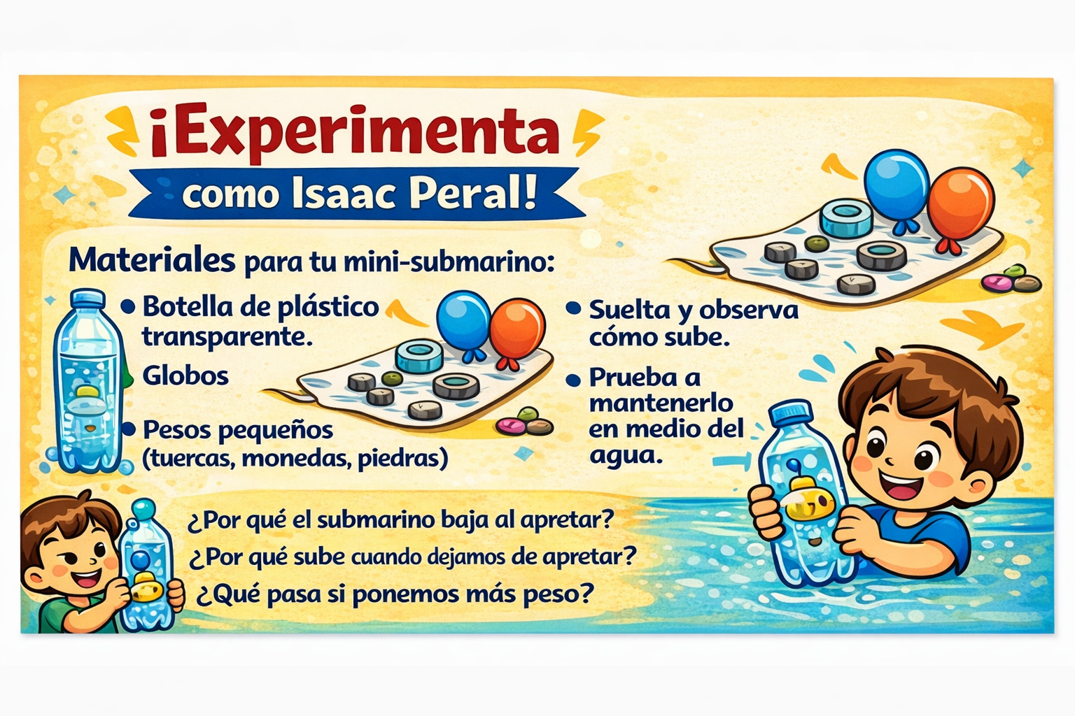 Hoy hemos comprobado que lo que parece magia es en realidad ciencia. Con una simple botella hemos entendido cómo un submarino puede subir y bajar gracias al control de la presión y la densidad.