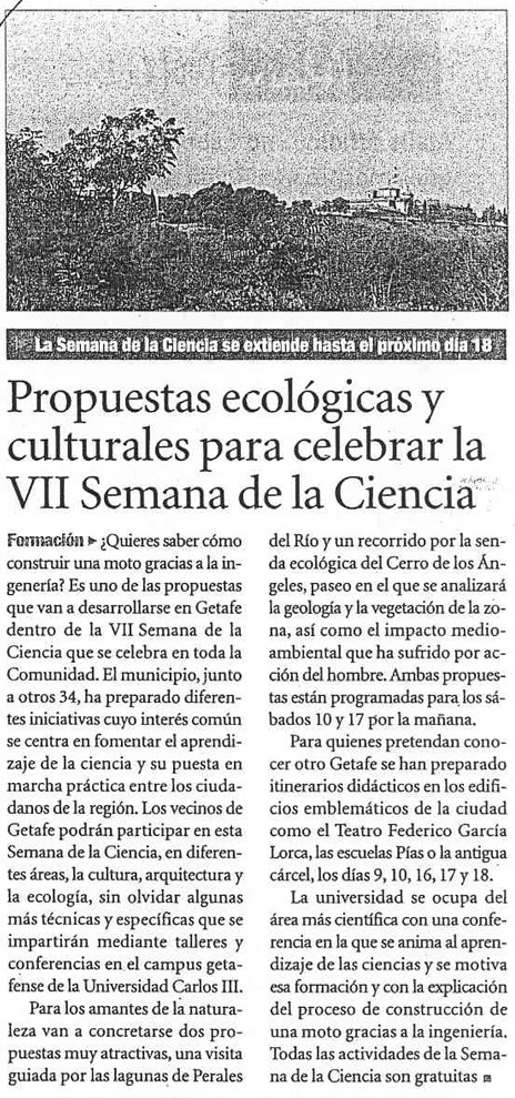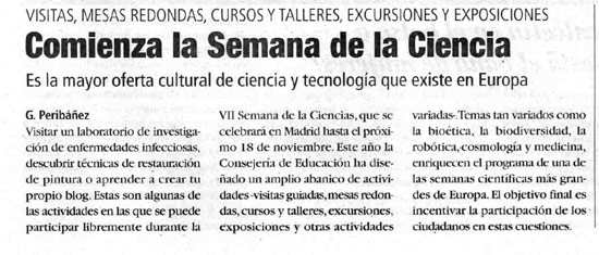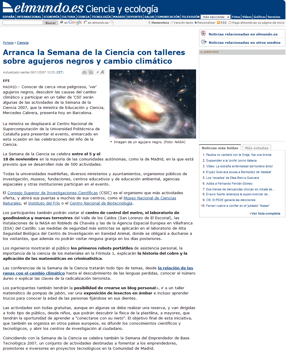 Conocer de cerca virus peligrosos, 'ver' agujeros negros, descubrir las causas del cambio climático y participar en un taller de 'CSI' serán algunas de las actividades de la Semana de la Ciencia 2007, que la ministra de Educación y Ciencia, Mercedes Cabrera, presenta hoy en Barcelona.
