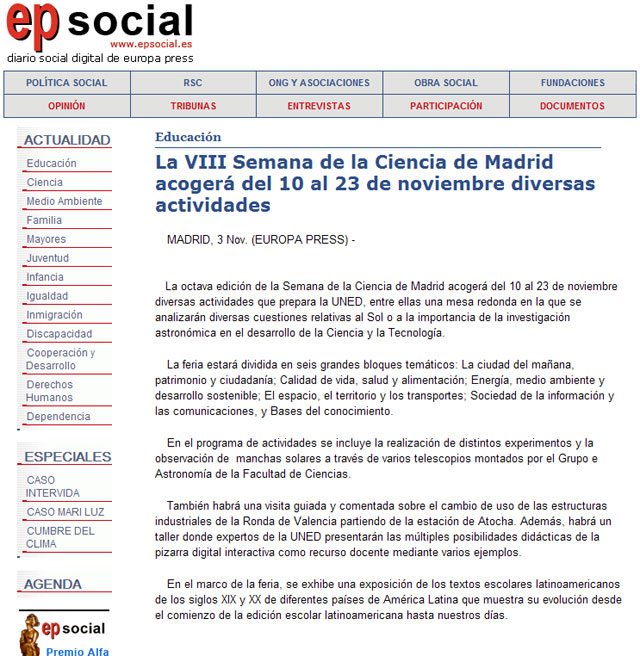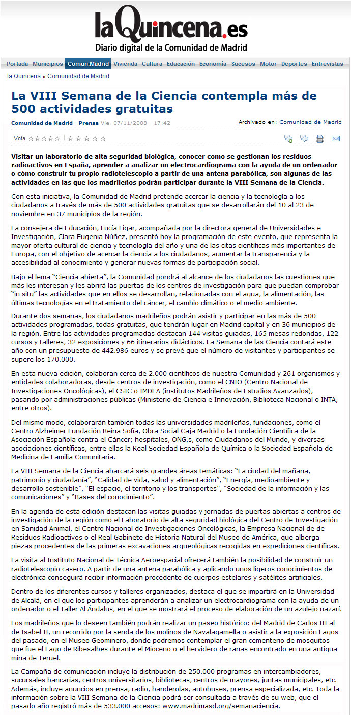 Visitar un laboratorio de alta seguridad biológica, conocer como se gestionan los residuos radioactivos en España, aprender a analizar un electrocardiograma con la ayuda de un ordenador o cómo construir tu propio radiotelescopio a partir de una antena parabólica, son algunas de las actividades en las que los madrileños podrán participar durante la VIII Semana de la Ciencia.