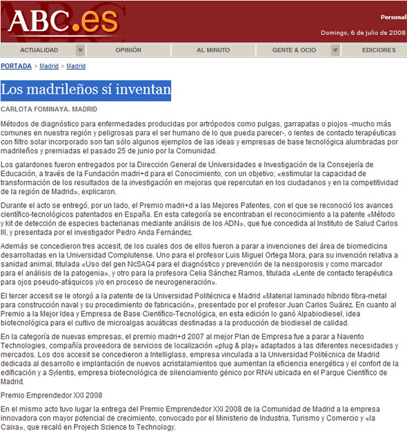 Métodos de diagnóstico para enfermedades producidas por artrópodos como pulgas, garrapatas o piojos -mucho más comunes en nuestra región y peligrosas para el ser humano de lo que pueda parecer-, o lentes de contacto terapéuticas con filtro solar incorporado son tan sólo algunos ejemplos de las ideas y empresas de base tecnológica alumbradas por madrileños y premiadas el pasado 25 de junio por la Comunidad.