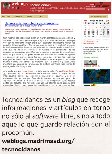 Tecnocidanos es un Bolg que recoge informaciones y artículos en torno no sólo al software libre, sino a todo aquello que guarde relacción con el procomún.