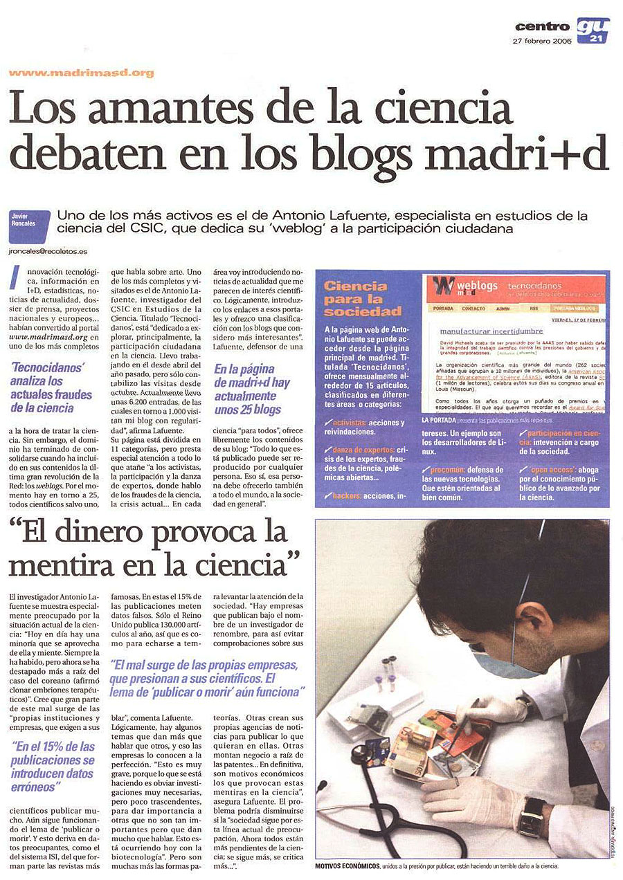 Uno de los más activos es el de Antonio Lafuente, especialista en estudios de la ciencia del CSIC, que dedica su 'weblog' a la participación ciudadana.