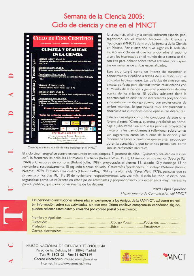 Un total de 123 actividades entre conferencias, coloquios, talleres, cursos, excursiones, proyecciones de cine, etc., han conformado la aportación de la Universidad Complutense a la V Semana de la Ciencia, organizada por la Comunidad de Madrid.