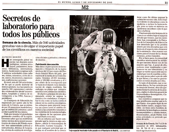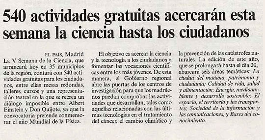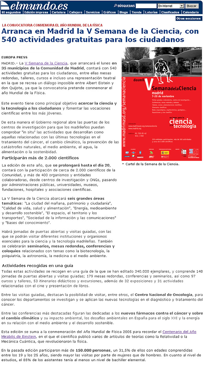La V Semana de la Ciencia, que arranca el lunes 7 de noviembre en 35 municipios de la Comunidad de Madrid, contará con 540 actividades gratuitas para los ciudadanos, entre ellas mesas redondas, talleres, cursos e incluso una representación teatral en la que se recrea un diálogo imposible entre Albert Eistein y don Quijote, ya que la convocatoria pretende conmemorar el año Mundial de la Física.