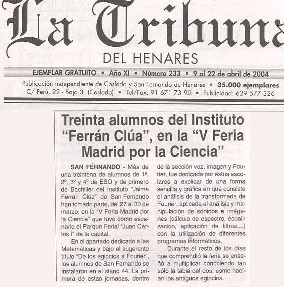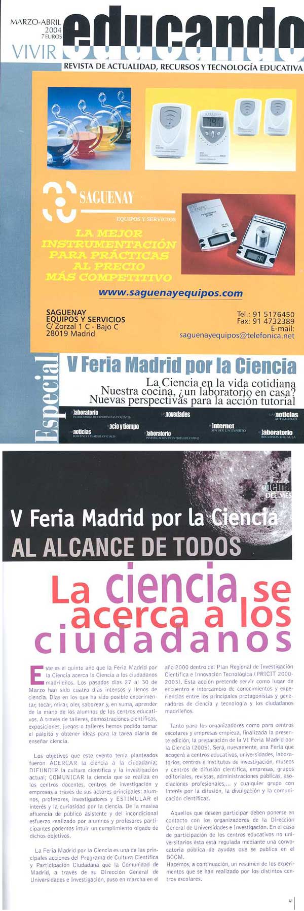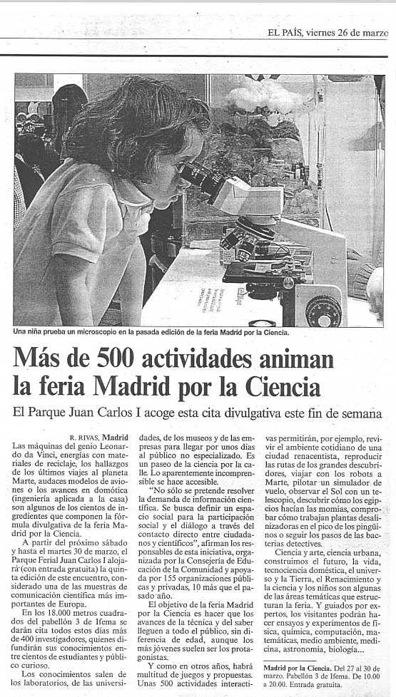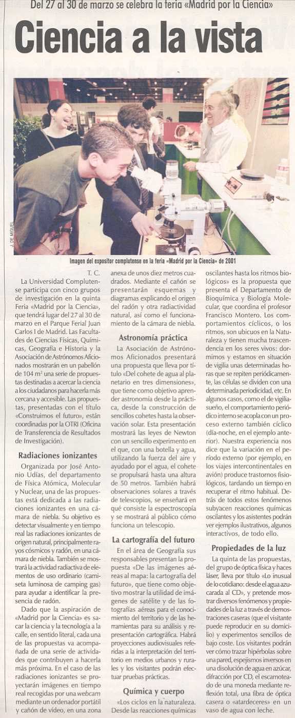 La Universidad Complutense participó con cinco grupos de investigación en la V Feria Madrid por la Ciencia, celebrada del 27 al 30 de marzo en el Parque Ferial Juan Carlos I de Madrid. Las Facultades de Ciencia Físicas, Químicas, Geografía e Historia y la Asociación de Astrónomos Aficionados mostraron una serie de propuestas para acercar la ciencia a los ciudadanos.