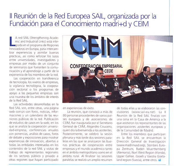 La Red Sail (Strengthening Academic and Industrial Links) está integrada en el programa de Regiones Innovadoras en Europa, para intercambiar experiencias y asimilar buenas prácticas, así como reforzar los lazos entre universidades, investigadores y empresas por medio de un conjunto de seminarios que fomenten la comunicación y el aprendizaje a partir de la experiencia de los miembros de la red.
