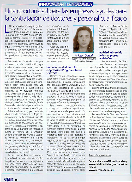 La sección de Recursos Humanos del Centro Virtual de Apoyo a la innovación madri+d (www.madrimasd.org/recursoshumanos), apoya la convocatoria de ayudas para la contratación de doctores y tecnólogos a empresas y Centros Tecnológicos.